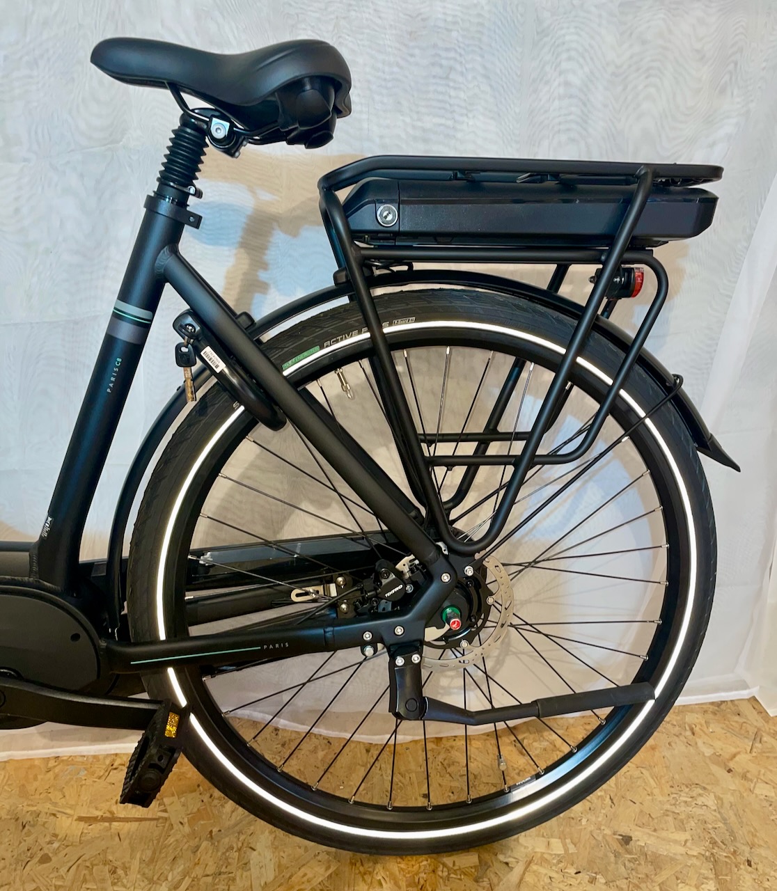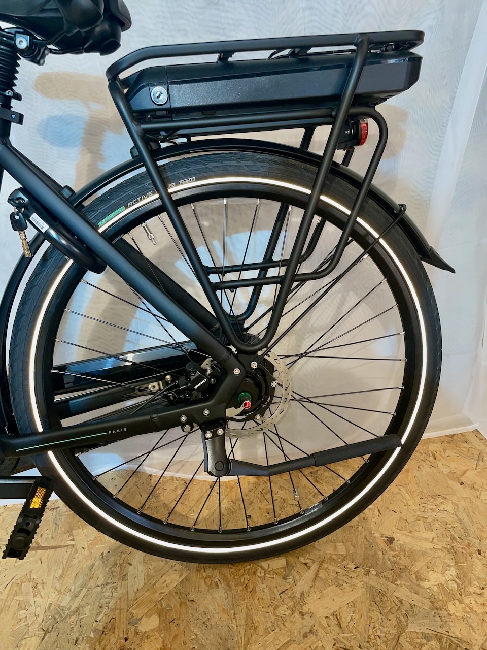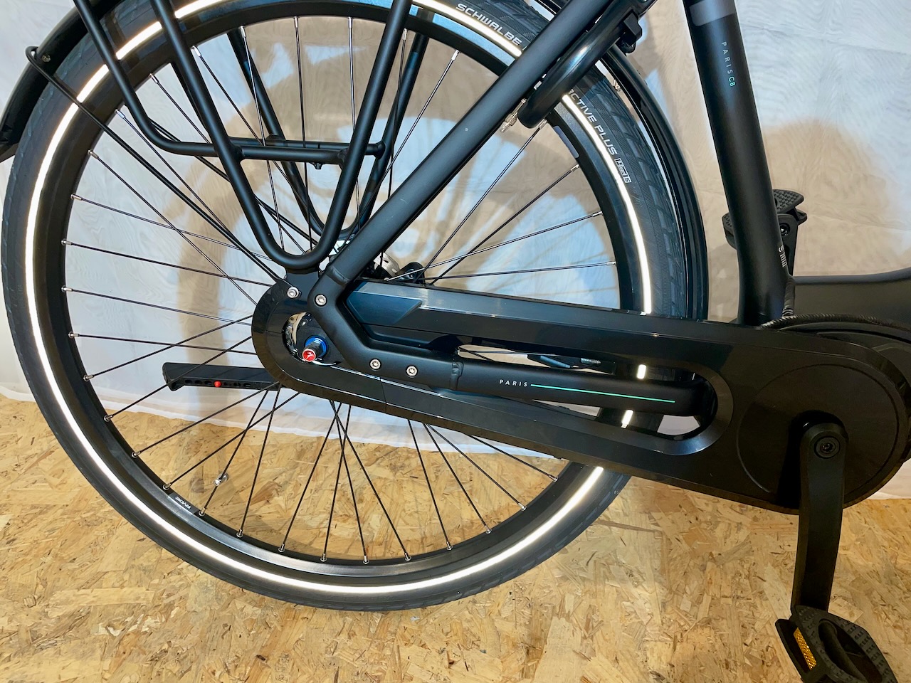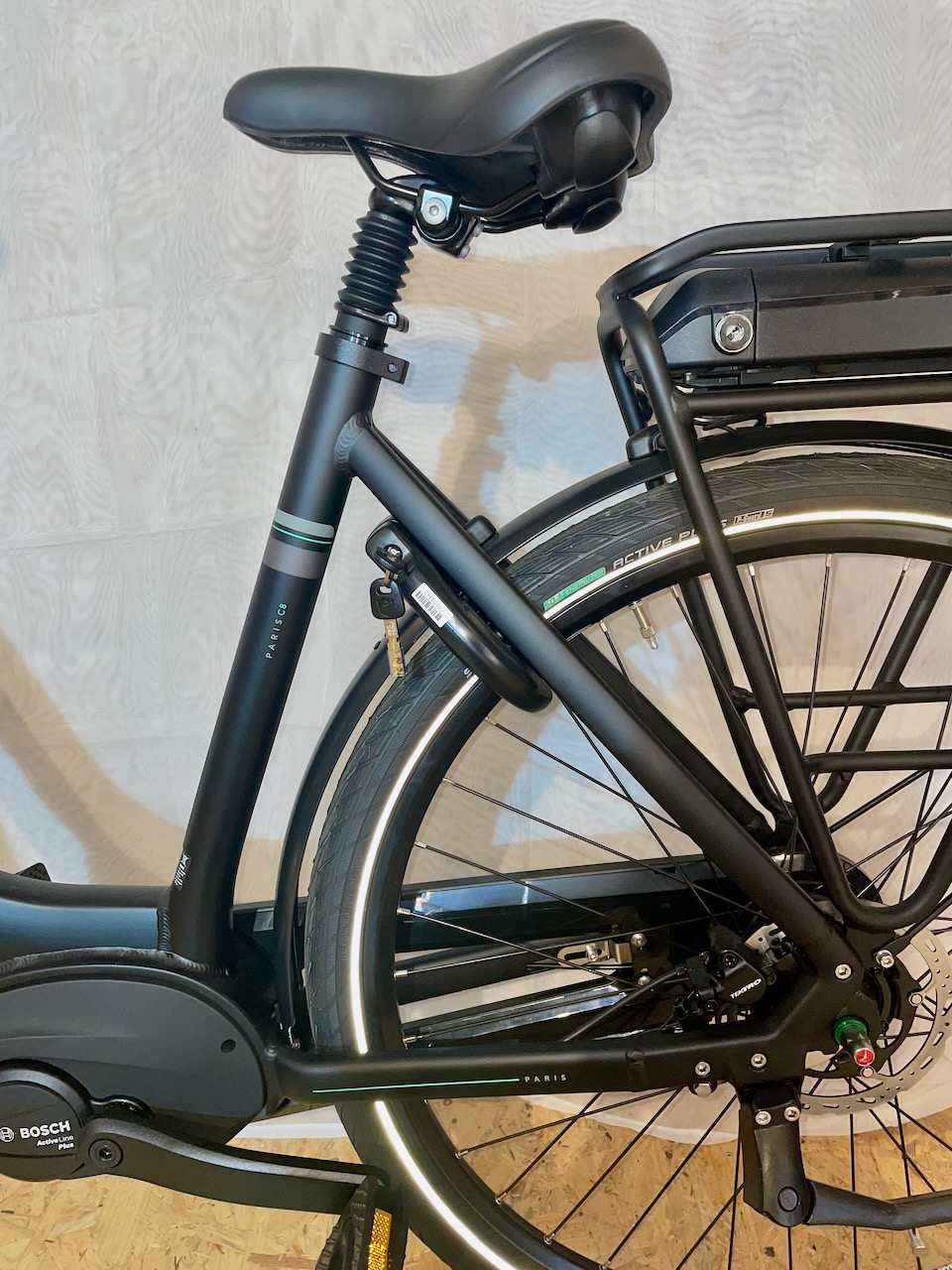 Gazelle Paris C8 in schwarz in der Rahmengröße 53cm und mit einem 500Wh Akku. Das Paris verfügt über einen Bosch Active Line Plus Motor mit 50 Nm. Zur Ausstattung gehören Scheibenbremsen vorne und hinten sowie eine Rücktrittsbremse. Komfortable 47mm Bereifung, breiter Komfort Einstieg – da Akku unter dem Gepäckträger verbaut.