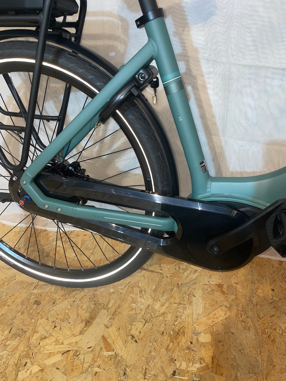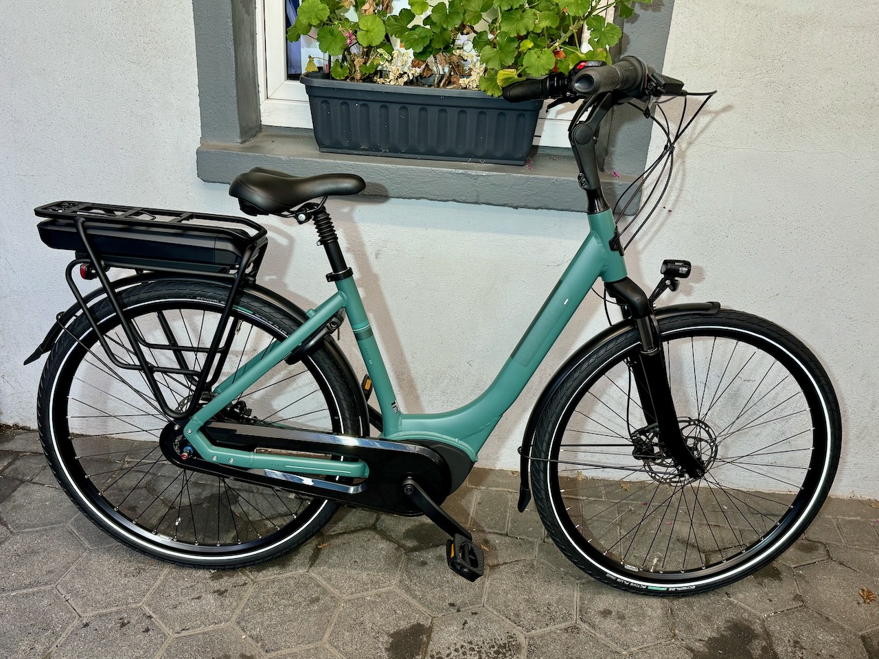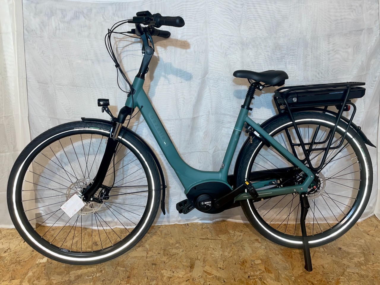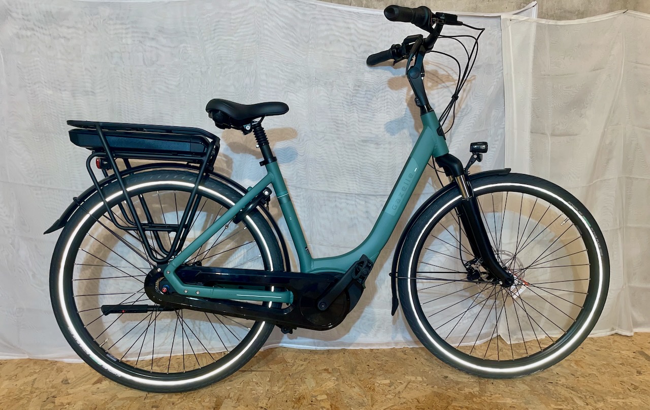 Schönes Gazelle Paris in der Farbe -Thyme Green- mit einer Rahmenhöhe von 49cm. Das Bike verfügt über einen Bosch Active Line Motor mit 50Nm und einer Akkukapazität von 400Wh.
